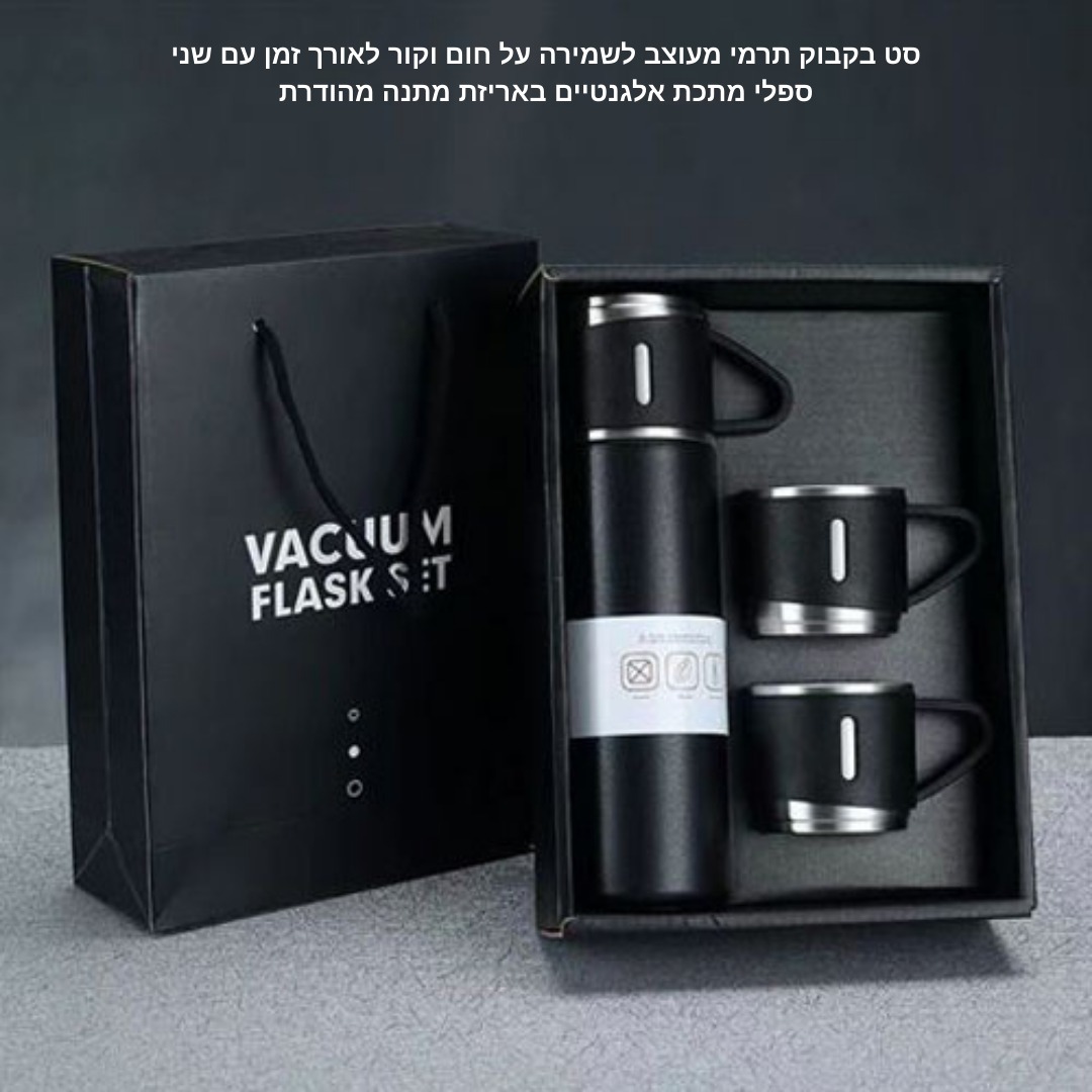סט אלגנטי הכולל תרמוס נירוסטה ושתי כוסות תואמות,