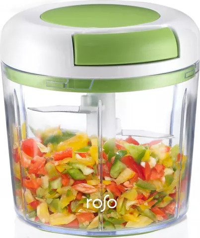 קוצץ ירקות ומעבד מזון קומפקטי עשוי פלסטיק איכותי עם שלושה להבים חדים, הפועל על ידי משיכת חוט בשיא המהירות.