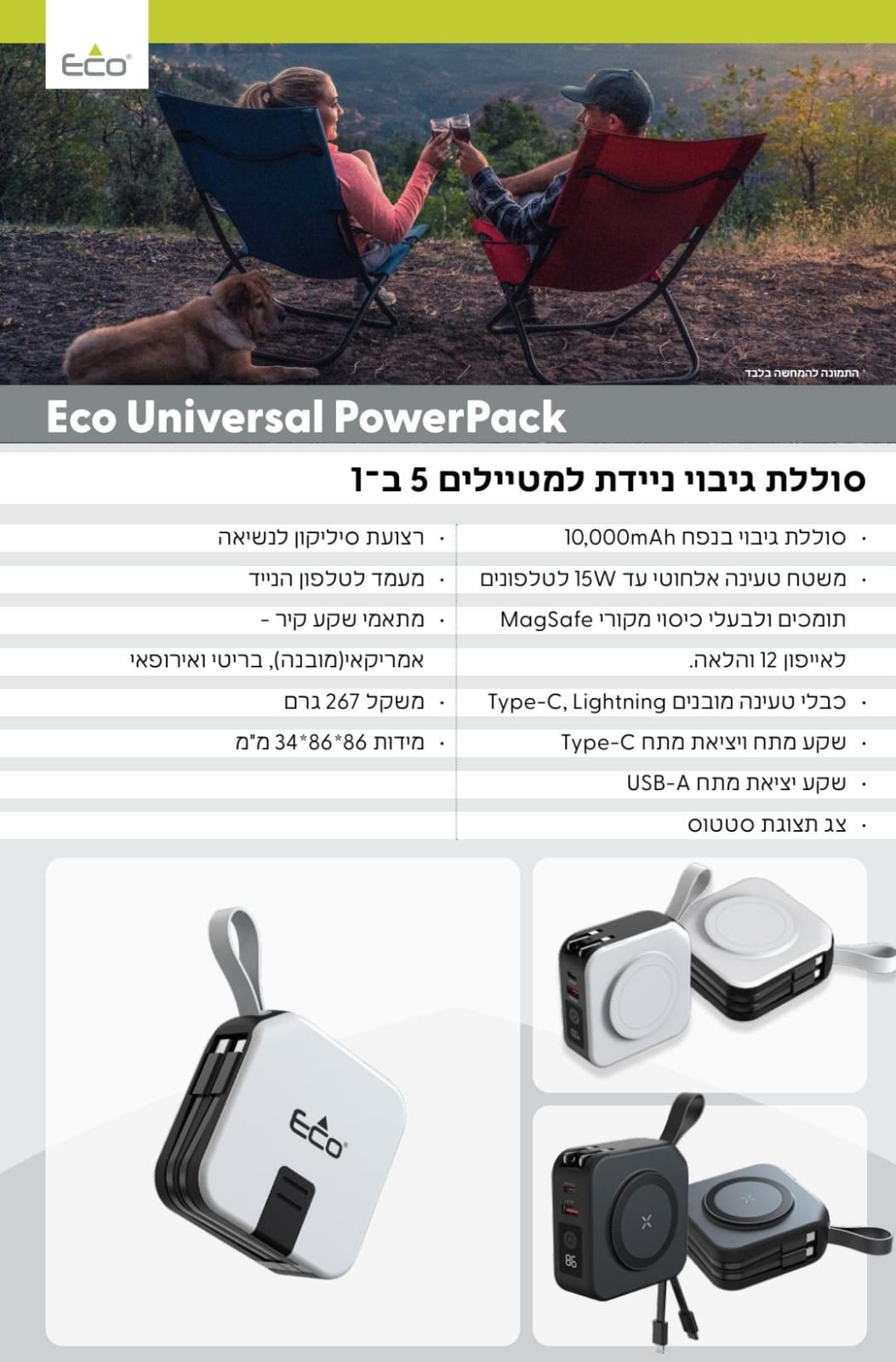 המטען האלחוטי החדש שמשלב את כל מה שצריך לטעינה יעילה ונוחה – משטח טעינה אלחוטי בהספק של עד 15W, סוללת גיבוי עוצמתית בנפח 10,000mAh, כבלים מובנים (Lightning ו-Type-C), חיבורים חכמים, ומעמד נשלף לטלפון.