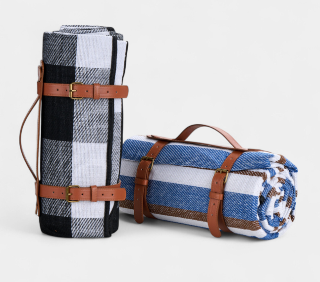 שמיכת פיקניק מתקפלת ארוזה ברצועת עור איכותית עשויה בד דוחה מים