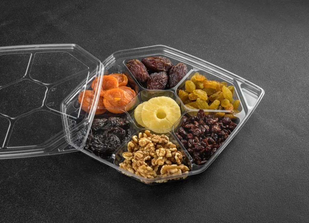 מגש מכיל 7 סוגים של פירות יבשים ופיצוחים מובחרים הארוזים במגש מחולק עטוף בניילון נצמד לשמירת הטריות.