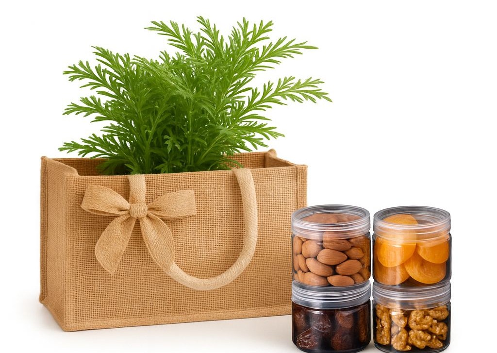 תיק יוטה עם 4 קופסאות רב פעמיות עם פירות יבשים ועציץ תבלין .