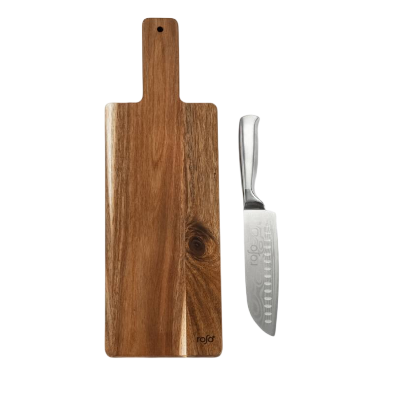 כולל קרש חיתוך מלבני עשוי עץ איכותי עם ידית לאחיזה נוחה וסכין סנטוקו מקצועית