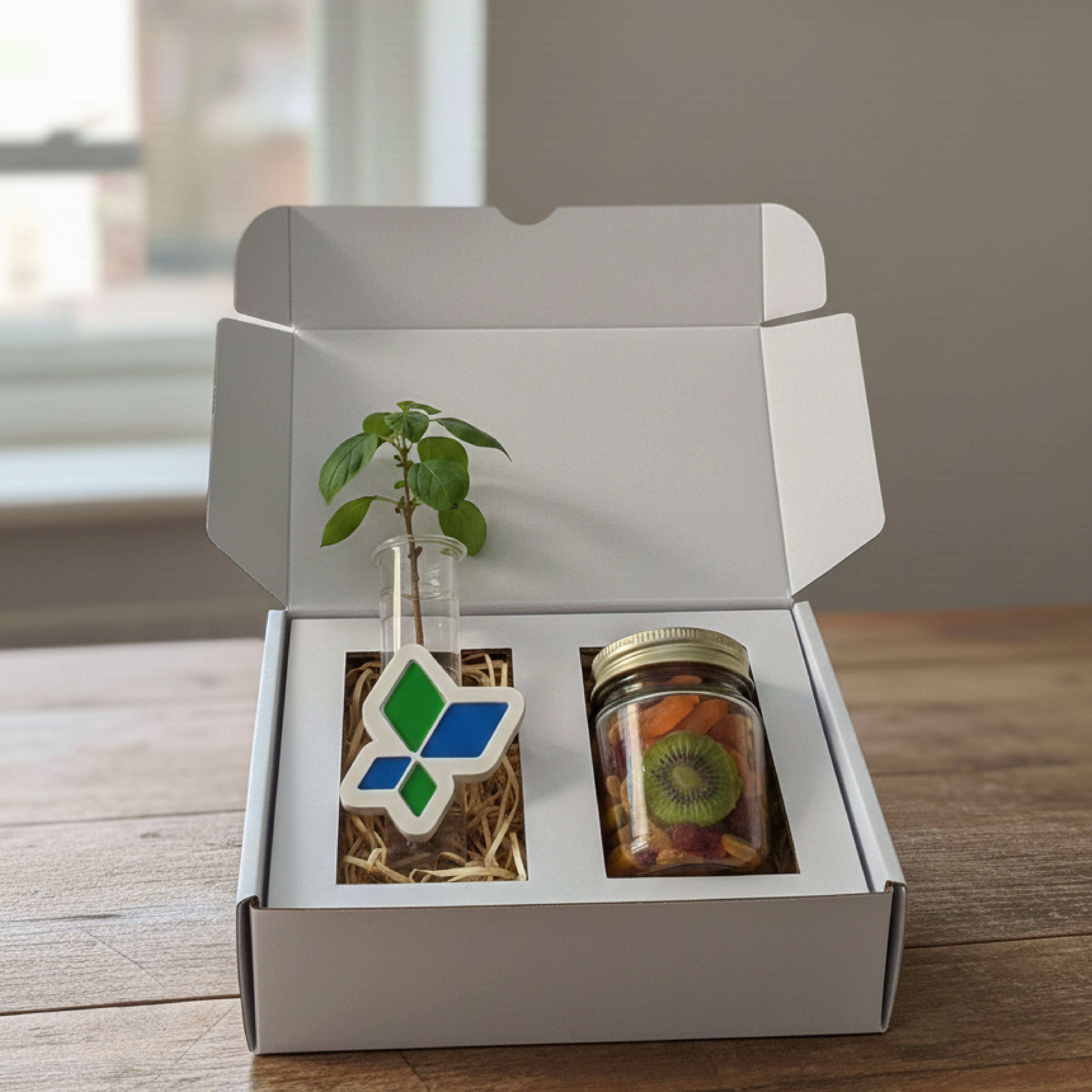 קופסת מתנה הכוללת אגרטל מגנטי משולב לוגו וצנצנת פירות יבשים 100 גר'