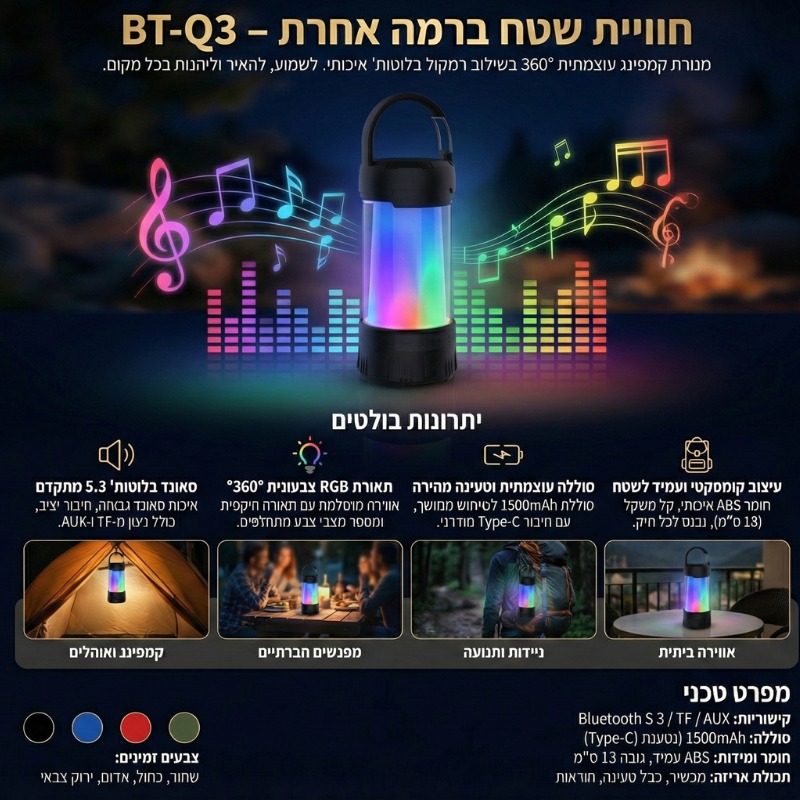 מנורת קמפינג משולב רמקול Bluetooth עם תאורת RGB
