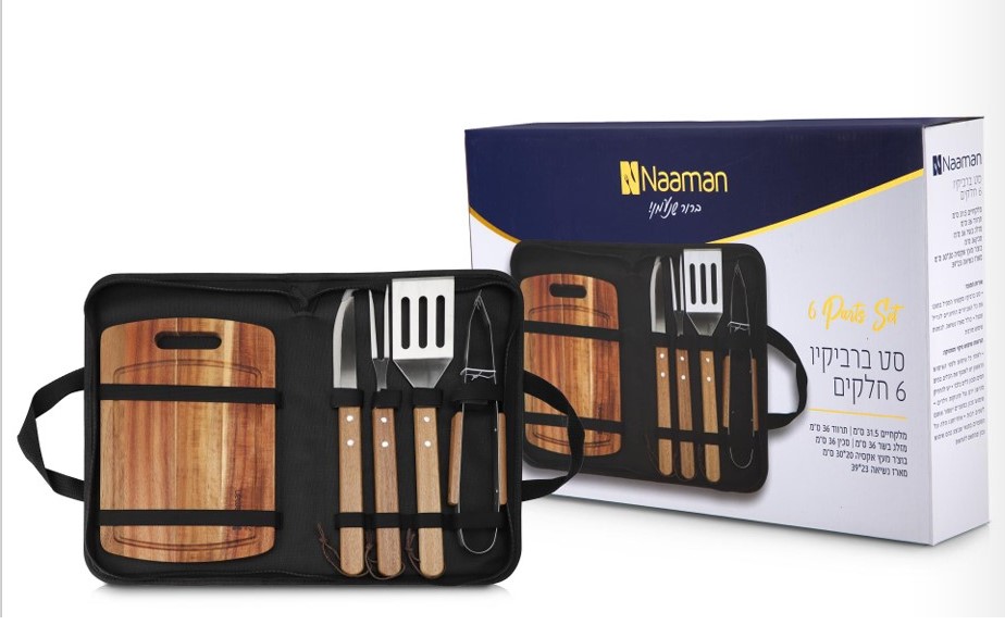סט ברביקיו 6 חלקים : מלקחיים, תרווד, מזלג בשר, סכין, בוצ'ר מעץ ומארז נשיאה.