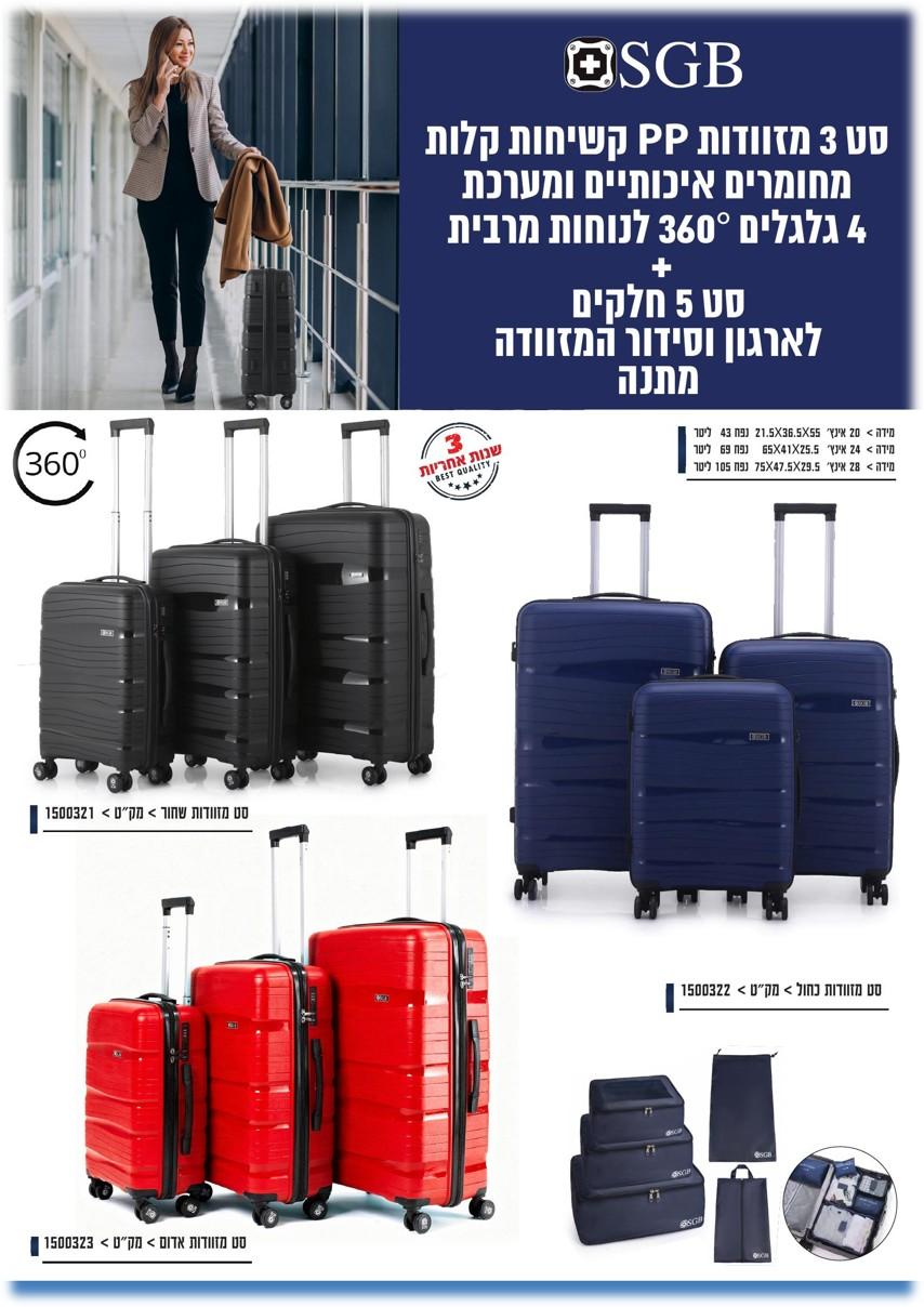 סט 3 מזוודות PP קשיחות וקלות, 4 גלגלים 360 מעלות לנוחות מירבית +סט 5 חלקים לארגון וסידור מזוודה