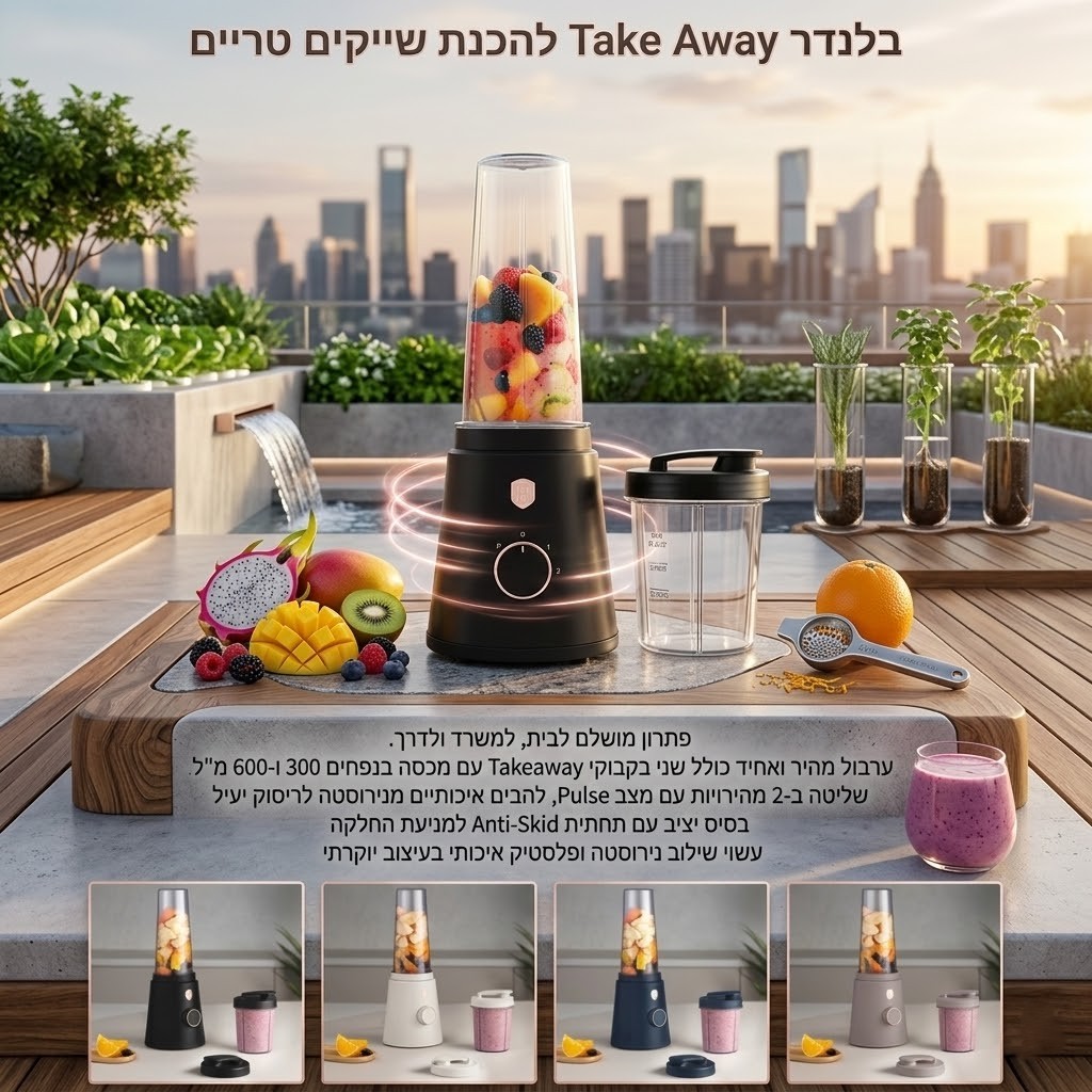 בלנדר שייקר אישי יוקרתי Take Away להכנת שייקים טריים , כולל 2 בקבוקים עם מכסה 300 ו-600 מ"ל בעיצוב יוקרתי במגוון צבעים .