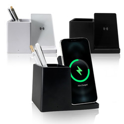 מטען אלחוטי מעוצב מבית EVERCHARGE משולב מעמד לנייד וארגונית לציוד משרדי ועטים