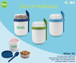 כוס עם כף ליוגורט, גרנולה, סלט, פירות. מכסה מופרד מהמכל לשמירה על טריות המזון