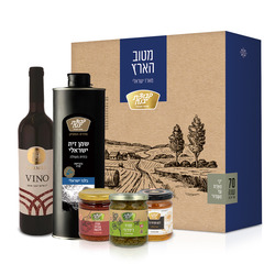 מארז ישראלי המכיל: שמן 500 מ"ל, מעדן פרי תות 284 גרם, ממרח עגבניות מיובשות 190