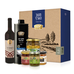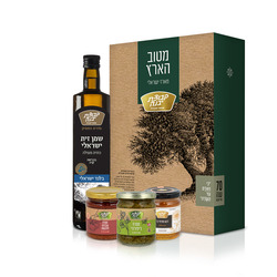 מארז ישראלי המכיל: שמן זית 500 מ"ל, צנצנת זית ללא גרעין 540 גרם, ממרח פסח וממרח